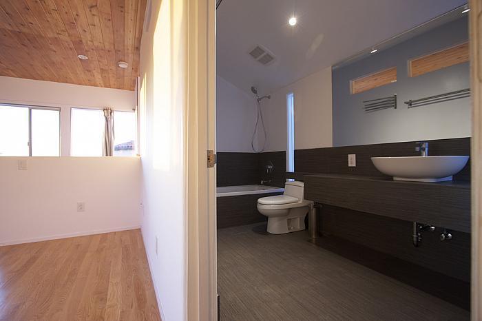 This apartment with nice shades of blue and a beautiful bathroom will help you to relax after work.